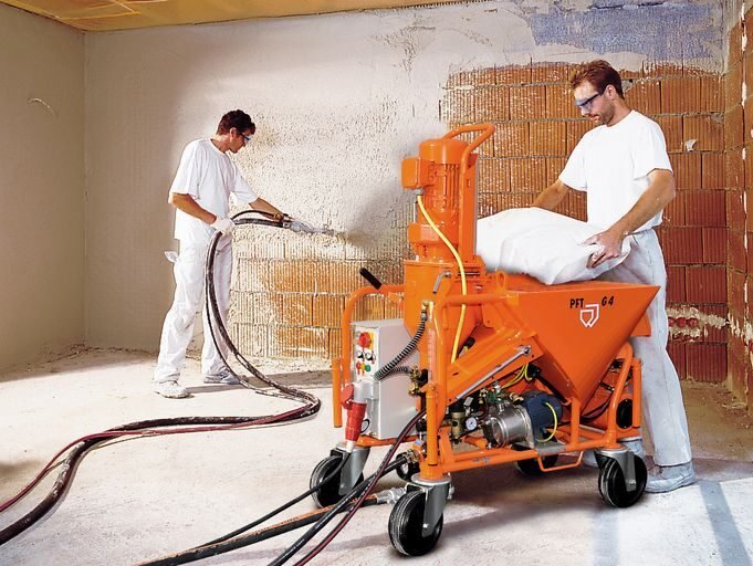 Mixing pumps – also called plastering machines or mortar pumps – of type PFT G 4 are suitable for all machine-standard dry mortars based on gypsum, lime and cement. The material container is separated from the mixing and pumping unit. The continuously and fully automatic G 4 can be started up and refilled at any time. It can be filled with bagged goods but also with a transfer hood directly from the silo / container or with an injection hood and PFT SILOMAT system. The PFT G 4 offers high conveying capacity and conveying distance and can be combined with the entire PFT machine program. The FC-230V version is ideal for renovation and renovation. A frequency converter (FC) ensures stepless speed control and amplification of the torque.