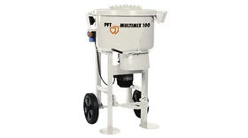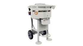 The PFT compulsory mixer (also called trough mixer) MULTIMIX is suitable for mixing various components, cement-based dry mortar as well as your own mixes, SPCC renovation mortar and PCC renovation mortar. The mixture is poured directly into the container and prepared with the prescribed amount of liquid. Counter-rotating stirring hooks ensure a homogeneous mortar mix, saving time. The mix is emptied quickly and cleanly via a flat slide at the bottom of the hopper. In connection with a PFT feed pump, semi-automatic work is possible. In this case, the PFT feed pump transports the mixed material directly to the processing site.