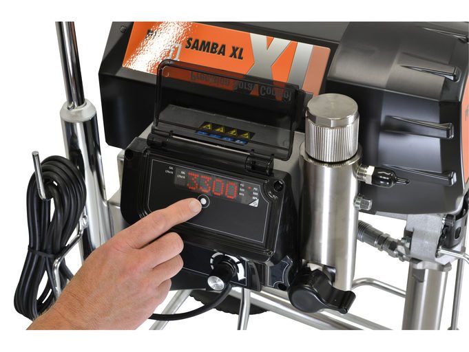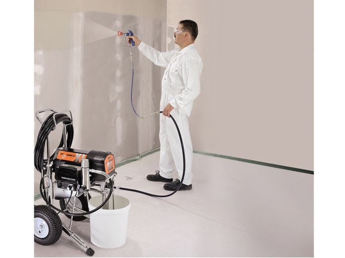 The PFT SAMBA XL airless spray gun is used to apply pasty materials such as paints, varnishes and even fillers precisely and quickly to walls and ceilings using a spray gun. The device works with an electric piston pump, which sucks in the paint through the movement of the piston. A control valve regulates the required working pressure, which is shown on a digital display. The model has a delivery rate of up to 5.5 l/min and is particularly suitable for abrasive, viscous materials. A conversion kit for air-assisted spraying enables attractive surface structures.